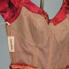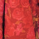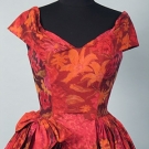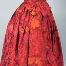 Floral print irridescent silk shantung in red jewel tones, labeled, lined in silk organza w/ tulle crinoline skirt, B 36", W 25", L 43", no flaws or mends, excellent.