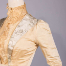 2-pc wedding gown of cream silk faille w/ reveres, covered decorative buttons & faux petticoat front of metallic patterned silk in wheat & wildflower motif, bobbin lace to high band collar, CF bodice & cuffs, falling front tabs edged w/ crimped ribbon & silver bullion, B 32”, L 17”, skirt W 22”, L 42”-78”, (shattering CB collar/SH, 3” tear left SH mended w/ organza, CF bodice shattering w/ 3” tear & few other sm tears, 1” seam opening rt underarm, 5” stain CF lap, loose stitches b/t skirt panels, moderate-heavy wear lower skirt, hem w/ 4” tear above CB hem, minor discoloration, hem lining heavily damaged) Fair. Deaccessioned by the Valentine Museum.