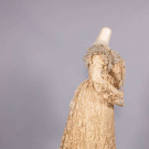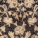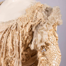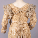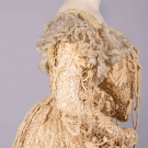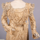 2-pc trained tea gown of ecru & cream tape & needle lace over silk crepe chiffon w/ pleated chiffon ruffles to SHs, knotted silk cord & tassel swags across bodice front & to CB W, bodice B 40”, L 16”, skirt W 22”, L 45”, (bodice relined & neckline altered, minor damage chiffon trim, most bodice closures missing, few broken brides, spot stains CF skirt up to 1”, chiffon layer of skirt lining shattering & fragile) Very Good. Deaccessioned by the Valentine Museum.
