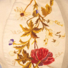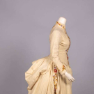 2-pc cream twill wool flannel day dress hand embroidered w/ satin stitch floral motifs in wool & silk to convertible collar, CF & CB of fitted bodice, cuffs, front of integrated apron overskirt & in vertical bands at skirt front, bodice B 32”, L 20”, skirt W 22”, L 40”, (minor discoloration cuffs & lower skirt/hem, few scattered tiny-0.25” holes, few tiny snacks & stains, wear & 0.5” hole Wband, few loose stitches CB gathers) Deaccessioned by the Valentine Museum. Very Good