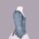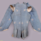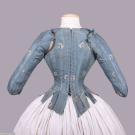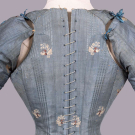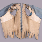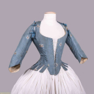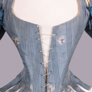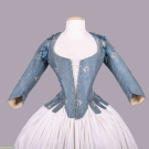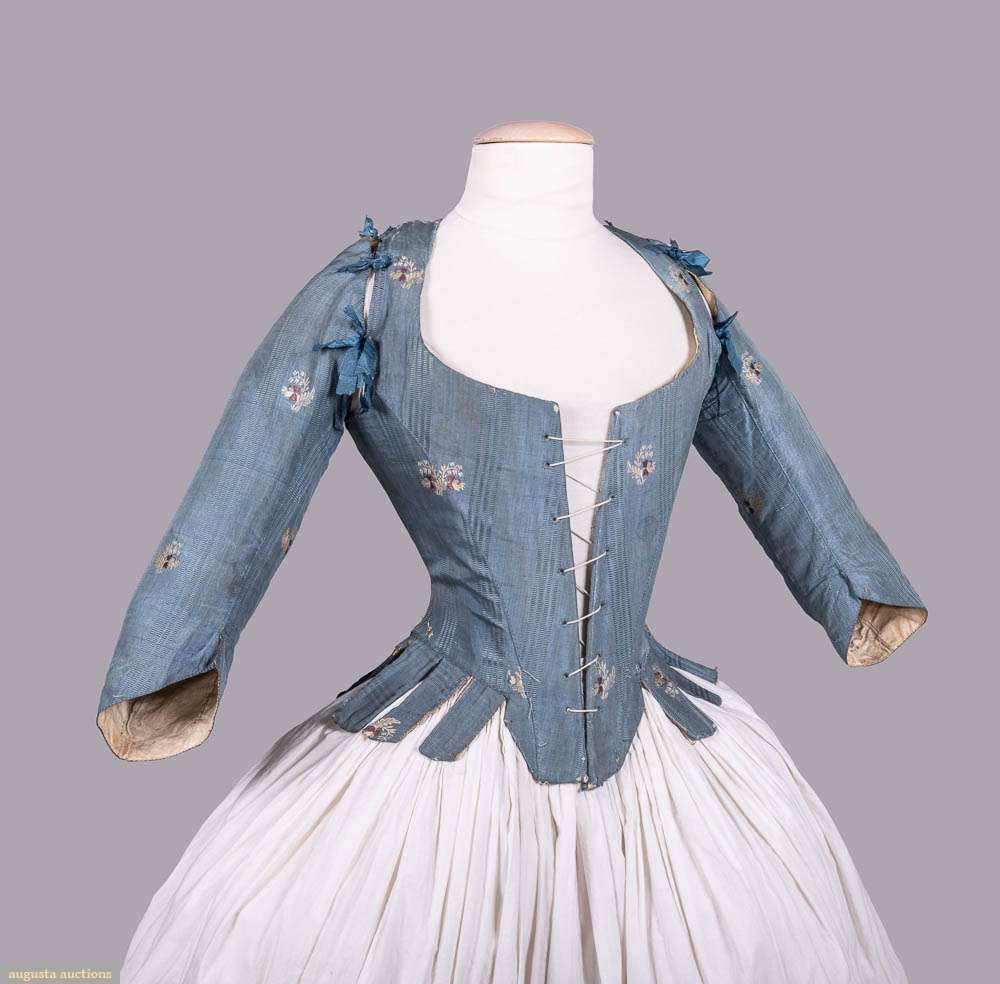 Slate blue silk brocade pair of stays, woven w/ small upright flower sprays of brown silk pansy, cream bluebells & foliate motif. detachable elbow length shaped sleeves tied w/ four blue silk ribbons, tabbed at lower edge, fully lined in linen w/ baleen boning, Italian or French, 1780-1790, B 29.5”, L 19.5”, (front laces N/I, 0.25” holes in silk CF placket, light wear to underarms w/ tiny-0.5” wear spots/hole along edge, wear to silk on lower tabs w/ tiny-0.25” holes, moderate wear CB tabs w/ few holes up to 0.75”, light 1” stain CF, shatter to SLV ribbons, minor discoloration & wear, few pin-tiny holes & stains) very good. Provenance: ex-collection of Pegaret Anthony, who acquired them from the estate of Mariano Fortuny.