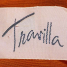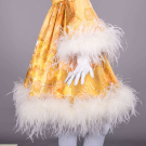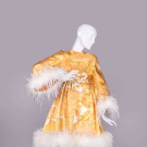 Party dress of silk satin w/ twill backing, printed w/ orange & yellow floral motif, overall linear white floral pattern superimposed, white ostrich & maribou feather trim at cuffs & hem, burnt orange taffeta lining, label “Travilla”, B 34” W 28 L 35-39”, (minor thread pulling throughout esp on SLVs and near neckline, small stains up to 1” throughout, few tiny holes throughout) excellent.