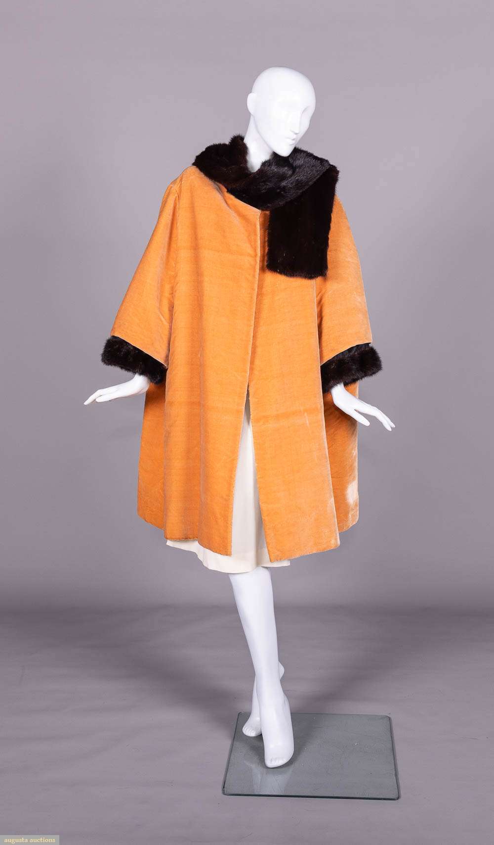 Peach silk velvet evening coat, detachable collar & cuffs of mahogany mink fur, fully lined in black silk satin, personally owned by Zsa Zsa Gabor, c. 1958-1959, label “Christian Dior, Paris”, likely designed by Yves Saint Laurent, B to 58”, L 39”, (moderate shedding to fur, broad light discoloration, few scattered tiny wear spots, few areas of light crushing, few 0.25”-1” light stains) good. Includes certificate of authenticity signed by Gabor’s widower, Prince Frederic von Anhalt.