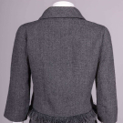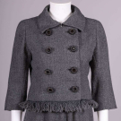 Grey wool boucle skirt suit, jacket w/ double breasted closures of metal spring rondel buttons, unraveled self fringe trim at jacket & skirt hems, jacket, label “Eisa” (Cristobal Balenciaga), B 37” L 17.5-19.5”, (second RT button loose with last LF removed, discoloration to lining at armpit, 6” seam openings on lining on either side, 0.5” seam opening on lining below RT armpit) skirt W 30” L 24.5-29”, (fringe trim detached from hem) Very Good.