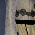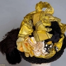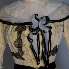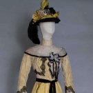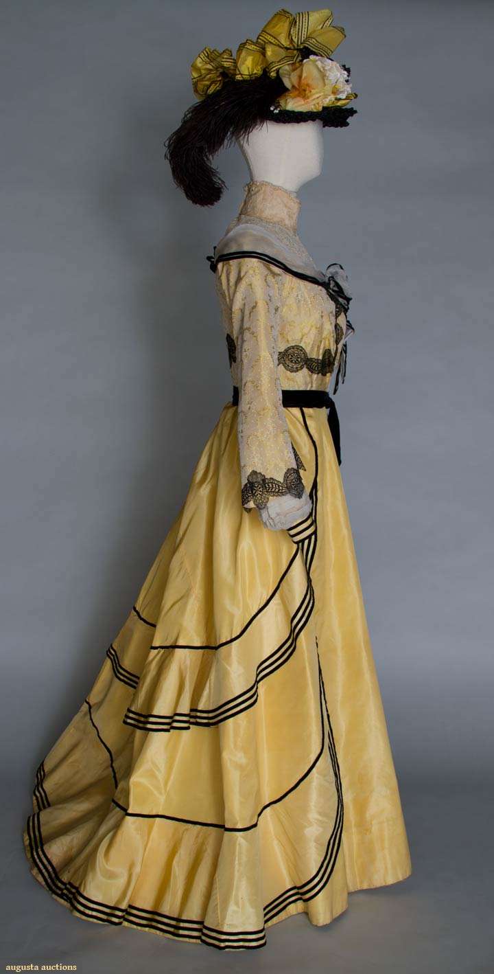2-piece dress & hat: yellow figured silk bodice, cream lace yoke & high neck, black lace applied bands, white chiffon w/ black velvet ribbon shoulder scarf, yellow silk faille skirt w/ black velvet ribbon trim, black straw hat w/ cloth flowers & silkribbon, B 32", W 23", Skirt L 42"-47", (light stains on skirt, waistband unstitched at CB) very good.