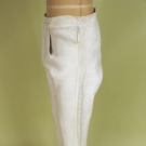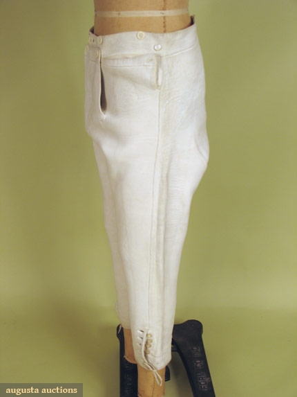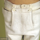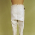 White leather, mid-calf length with very long rise, narrow 5" fall front, suspender buttons, leather ties at calf below knee buttons, ivory and m1890-1920 of pearl buttons, (minor discoloring) excellent.