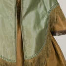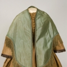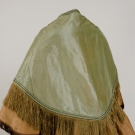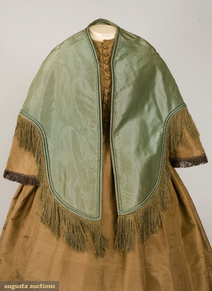 Shaped short mantle of ribbed silk taffeta, self fabric cording around outer edge, fringed with olive green 5" silk fringe, (small scattered brown stains, tiny holes) good.