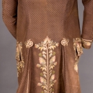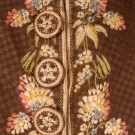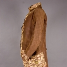 Brown uncut voided velvet in checked pattern, embroidered with silk multi colored brush-like flowers, standing band collar, trimmed with twenty six large embroidered buttons, shaped pocket flaps, long fitted sleeves ending in 3.25" embroidered cuff, upper body padded with cotton batting, cream silk satin lining, (seams unstitched and mended, underarms faded, band collar worn, lining severly torn) excellent.
