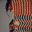 Geometric pattern hand-woven in red & blue wool w/ white cotton, wave form borders, 67" x 91", (minor moth damage & fringe loss) good.