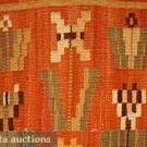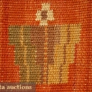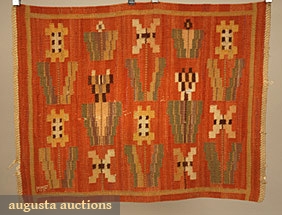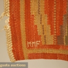 Flatwoven tapestry in brick red, green, brown, lavender, salmon, & gold, depicting in horizontal arrangement various single stem flowers in flower pots, signed w/ monogram MMF lower left, 19.5" x 26", (slight wear, small hole in field, small breaks in selvedge) good.
