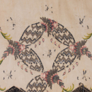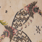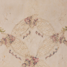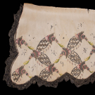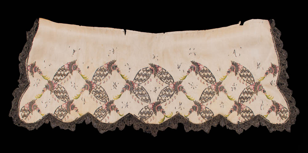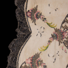 Bone silk moire w/ silver metallic bobbin lace edging, lower half hand embroidered w/ silver sequins & bullion, silk floss in shades of green, pink, blue & cream, twisted & crimped silver metallic couched embroidery, 50” x 20”, (broad discoloration, many missing crimped metal pieces, some loose/missing embroidery stitches, heavy wear across top w/ tears up to 1.5”, heavy wear & tattering to lace, tarnish to metallic threads) fair.