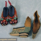 Blue silk embroidered w/ floral design, quilted bottom, (few holes in muslin backs) good; t/w pair of child's 20th C appliqued slippers in fanciful animal form, excellent.