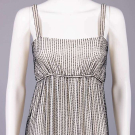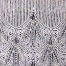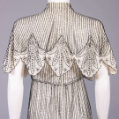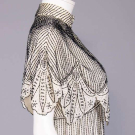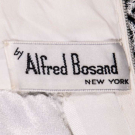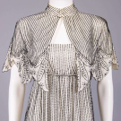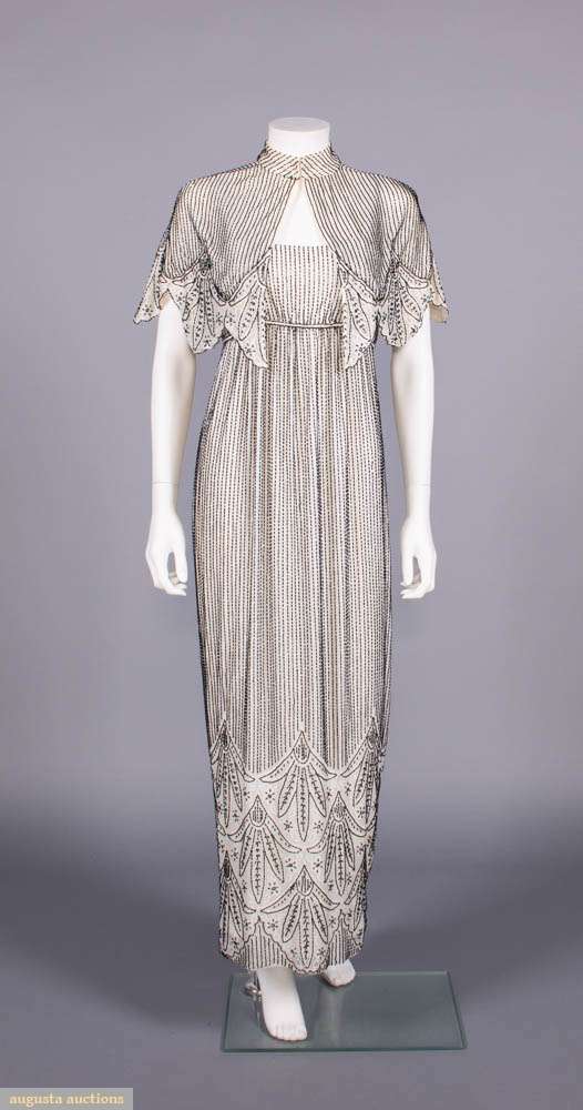 2-pc white woven silk lace over-embroidered w/ short black bugle beads c/o evening dress w/ slender SH strap, empire W, & narrow ankle length skirt, satin back, crepe lining, & matching SH cape w/ hook & eye closure, band collar & shaped hem, label “Alfred Bosand, New York”, shrug L 15”, dress B 32”, W 26”, L 54”, (minor fraying along hem, few thread pulls, light discoloration underarms & lining, few missing beads, dress lining possibly replaced w/ hem fallen) excellent.