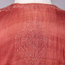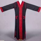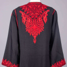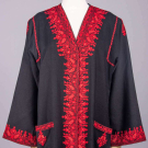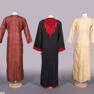 2 Indian silk kurta w/ shadow stitch embroidery & MOP buttons: 1 brown w/ cream embroidery, CH 42”, L 52”, (missing 2 buttons CF, light wear, few light stains up to 4” lower CB skirt, minor discoloration SH) & 1 cream w/ cream embroidery, CH 38”, L 54”, (minor discoloration lap & seat, few light stains tiny-1.25”, light wear); 1 black wool twill robe w/ scarlet & brown tambour silk embroidery, free front, long sleeve & symmetrical front patch pockets, SH-SH 22”, CH approx. 42”, L 55”, (belt missing, tiny pulls, repaired snacks/holes up to 0.5”, light wear to collar, few very light stains up to 1” near hem) both very good.