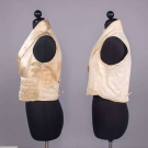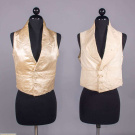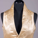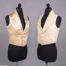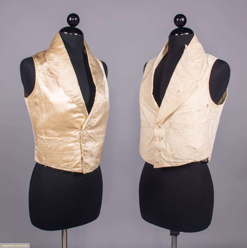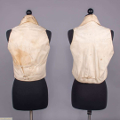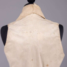 1 cream silk satin w/ self covered buttons, cotton backing, CB ties 1833, CH 32”, L 19”, (1.5” light red stain right collar, 0.5”-1.5” black marks CB collar, discoloration across SH/collar, heavy wear/fraying to collar, pockets & hem, cotton back discolored) fair; 1 white cotton pique w/ self covered buttons, cotton backing, CB tie, notched shawl collar, 1838, CH 34”, L 18”, (2” ragged hole front left under lapel, tears up to 2” at collar, other 0.5”-1” tears lower CF, broad discoloration & staining) fair Deaccessioned by the Valentine Museum.