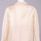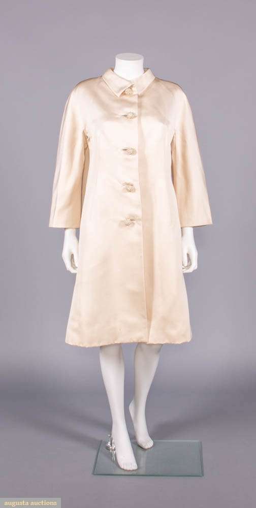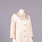 Cream silk twill w/ shirt collar, CF ball button closures encrusted w/ domed moroccan silk thread miniature buttons,glove length slvs, lined w/ silk, label “Balenciaga, 10 Avenue George V, Paris” couture # “103865”, SH-SH 20”, B 42”, L 39”, (2 very light 4” tidemarks CF, light 1” mark below 2nd button, tiny spot stains/foxing esp. lower front, few very light stains up to 2” near hem, 0.5” wear spot back right SH, few sm wear spots esp. along edge of hem, very minor seam strain at underarms, light wear/discoloration to buttons) good. Provenance: From the Estate of Lydia Gordon.