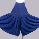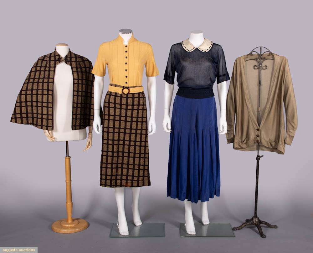 3-pc knit ensemble c/o yellow short slv button-up w/ matching belt, yellow & brown cape w/ tie tack button closure & calf length skirt, c. 1939, label “Caltex Sportswear, Los Angeles, Calif.”, B 34”-36”, L 21”, skirt W 28”, L 30”, cape SH-SH 18", L 25", (tiny holes/pulls, minor discoloration, 2” fade spot skirt hem, 1” repair lap) 1 navy blue knit top w/ white leather peter pan collar, B 36”, L 22”, (slip N/I, 1.5” repair right SH & 1” CB collar, sm holes, W elastic shot); 1 xanadu knit cardigan, (light discoloration, tiny pulls/holes/stains, few SS openings <1”); 1 pair of blue culottes w/ let out box pleats, 1930s, W 22”, inseam 22”, L 35”, (2” seam opening crotch, few sm openings/holes, light stains) all good-excellent. From the Estate of Lydia Gordon.