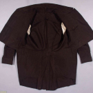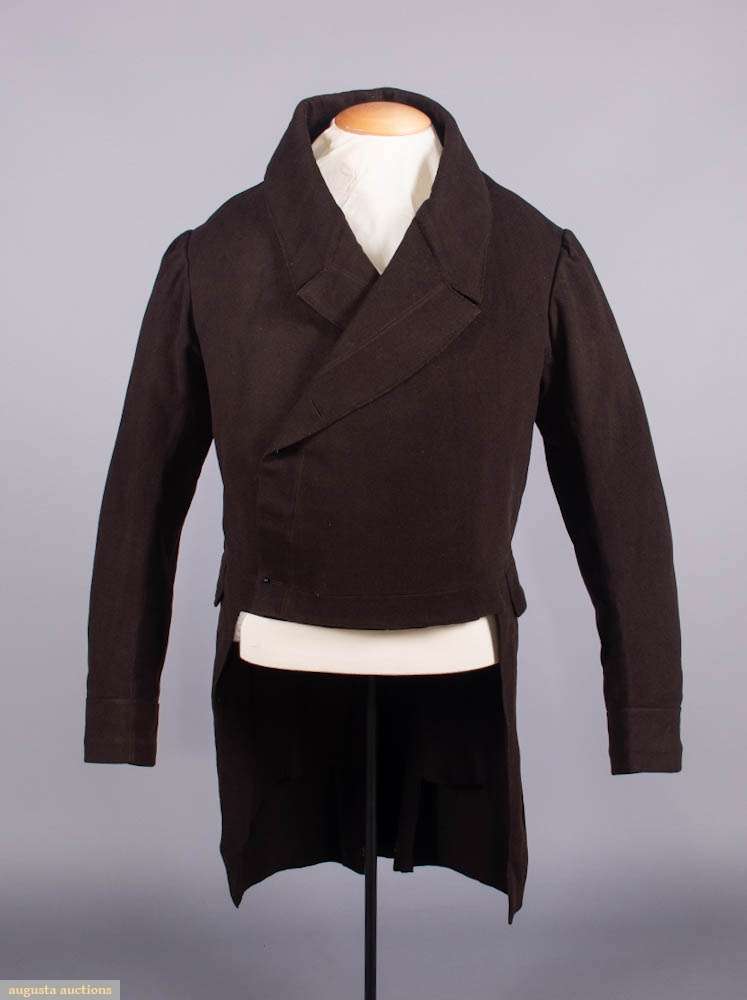 Gentleman’s cutaway tailcoat of brown wool broadcloth w/ high notched collar, broad double breast, broad back pocket tabs, interior breast pocket, 1820 -1830s, SH-SH 28”, CH 50”, L 22”-40”, (all buttons missing, few tiny holes esp. CF from button removal, 5” & 4” seam openings along CF hem) excellent. Provenance: From the Estate of Lydia Gordon.