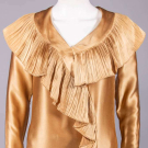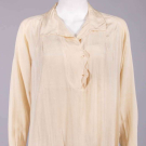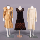 2-pc gold silk crepe back satin w/ knife pleated shawl collar into faux surplice drape, long slv w/ snap wrist, skirt w/ turn back ruffle at left SS, 1928, B 33”, L 28”, skirt W 32”, L 24”, (0.75” opening rt underarm, heavy wear, loose closures, minor discoloration seat) good; 1 brown silk velveteen w/ soutache lattice insertion to neck, back W & above hem, integrated ecru silk slip w/ tangerine skirt, 1924, B 34”, W 30”, L 45”, (5” tear back left armscye, seam openings up to 5”, CB bodice altered, lining shattered) fair; 1 white silk crepe long slv w/ shirt collar, shaped CF button placket, draped Wband & single patch pocket at right H, 1925, B 40”, W 38”, L 44”, (collar/cuff buttons missing) good, (all w/ sm stains/light crushing/strain) Valentine Mueum
