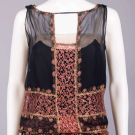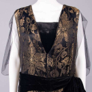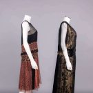 1 black silk chiffon w/ pink & gold lame’ lace insertions & overlay, embroidered w/ pink silk threads in vining floral motif accented w/ gold & crystal beads, silk slip included, B 33”, W 30”, L 45”, (few sm breaks in lace, few missing beads, few pulls, few fallen pleats, few sm holes in underdress) excellent; 1 black silk satin lame’ brocade w/ black net open sleeve, black silk velvet B insert, back panel & draped front W band, B 34”, W 32”, L 48”, (minor pulls, minor tarnish to lame’, several sm holes & pulls in tulle slvs, light wear at underarms, few loose stitches at W band) very good. Deaccessioned by the Valentine Museum.