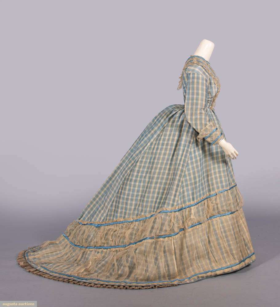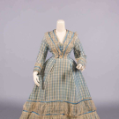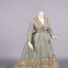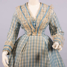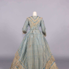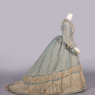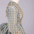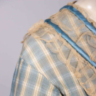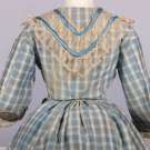 2-pc blue & white checkered silk dress w/ satin & tarlatan trim, brocade covered CF buttons, B 32”, L 13”, skirt W 20”, L 38”-60”, (bodice placket altered, light stains up to 1”, minor discoloration, minor shatter CB collar & cuffs, 1” & 4” tears CF W, light stains up to 3”, discoloration at hem, some satin trim loose w/ minor shatter esp. hem, tarlatan trim discolored w/ many tears esp. CB skirt/hem) fair-good. Deaccessioned by the Valentine Museum.This material was donated as part of a trunk, found in Copley, Albemarle County, VA