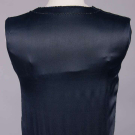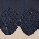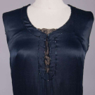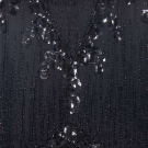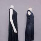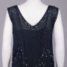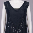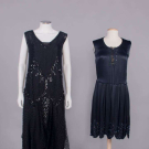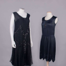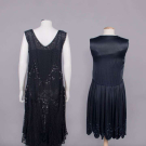 1 black georgette w/ sections embroidered in varied faceted black beads, iridescent half bugle beads & sequins, black silk & linen lace bodice overlay & lower flounce, B 36”, W 42”, L 44”, (melted sequins w/ torn lace up to 1” at underarms, few missing beads/sequins, seam openings up to 6” b/t lace & beaded panel at center, few repairs at seams, few sm holes in lace); 1 midnight navy silk satin w/ black iridescent bugle beads, keyhole front w/ lame' lace backing, corded band to drop W,scalloped hemline, B 32”, W 30”, L 38”, (light fading, few missing beads, gold lace tarnish at CF, taken in 1” at SS & SH, W altered, few tiny holes) both very good.