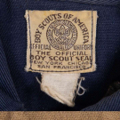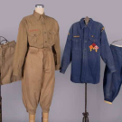 3-pc Boy Scouts uniform of green cotton twill c/o jacket w/ metal insignia buttons, shorts & knickers, c. 1914. “Sweet-Orr Union Made, Boy Scouts of America Official Uniform”, CH 40”, L 28”, pant W 26”, inseam 20”, shorts W 28”, inseam 6.5”, (tarnish, sm stains, discoloration/wear, 2” tear left pant hem, 1” stain left leg, shorts hem taken up); 2-pc navy cotton twill Boy Scouts uniform c/o long sleeved shirt w/ cub scout emblem patch & patches at sleeves, matching breeches w/ knit cuff, 1946-1949, label “Boy Scouts of America Official Uniform”, CH 38”, L 26”, pant W 28”, inseam 17”, (tarnish, wear/discoloration, 1.25” repair left leg, pulls, fading) all good-very good. Deaccessioned by the Valentine Museum.