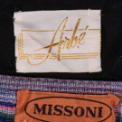 1 screen printed silk button-up blouse, label “Ariele, Firenze, Made in Italy”; 1 purple knitted silk vest, label “Missoni, Made in Italy”; 1 black tunic vest embroidered w/ bugle bead & donut shaped paillette, 1960s, label “Arbe”; 1 ombre pink blouse w/ hand painted florals, 1960s, all very good-excellent. Measurements & condition report available upon request.
