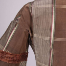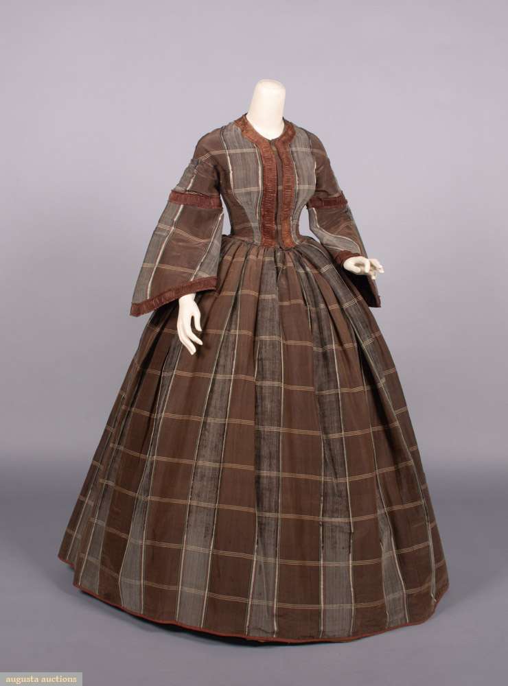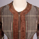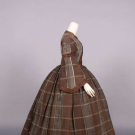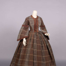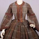 Wool & silk blend day dress in ikat warp ribbon stripes on large windowpane ground w/ brown silk quilling to pagoda sleeve & neckline into either side of CF closures, lined in twill cotton, glazed hem facing, wool hemsaver, B 30”, W 24”, L 56”, (CF closures altered, 6” horizontal tear lower left skirt, underarm discoloration & shredding, broad light wear esp. to grey stripes, heavy wear at W pleats, several 0.5”-3.5” light stains around hem) Good.