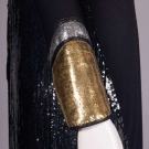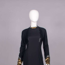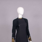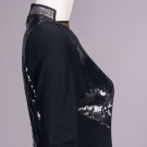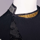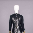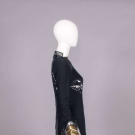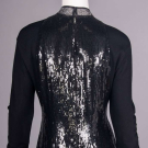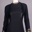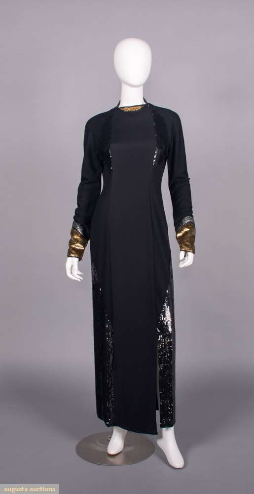 Evening gown of black wool jersey & silk w/ B & back panels encrusted w/ black sequins, gold & silver tinsel collar & cuff w/ black silk & tinsel edging, zip cuff & CB closure, label “Geoffrey Beene”, B 35”, W 30”, L 58”, (zipper sticks w/ some fraying & sequin damage along upper track, light wear, few tiny pulls) Good. Provenance: sold 11/20/19 Hindman’s Property from the Geoffrey Beene Archive, lot 192, Archive Inventory #17