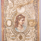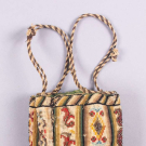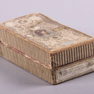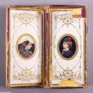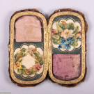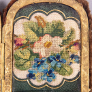 1 sheared beaver spectacle case w/ Viennese petit point, 1860s, 3” x 6”, (light wear & crushing exterior, 6” separation b/t fur & frame, discoloration to lining, minor tarnish, latch broken) good; 1 merino wool ombre Berlin work embroidered reticule w/ faceted metallic beads patterned silk lining, 1860s, 6” x 6”, (moderate thread loss, minor bead loss, minor shatter lining) Good; 1 paper handkerchief box w/ lithograph medallions of regional ladies, c. 1870, “Henry Matier & Co, Belfast”, (broad wear & discoloration, some loss to interior) Fair.