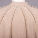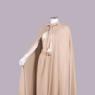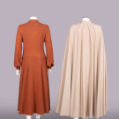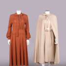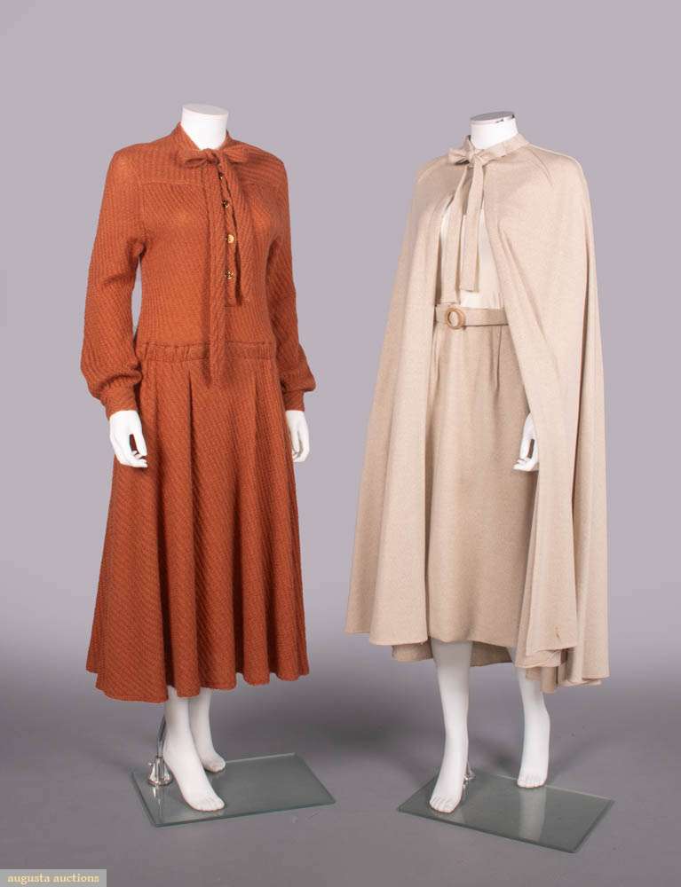 1 long sleeved sienna mohair blend diagonal rib knit dress w/ stirrup motif enamel buttons, 1970s, label “Gucci”, B 34”-36”, W 30”-32”, L 49”, (light wear, minor shatter Wband lining) Excellent; 3-pc heathered cream tricot c/o cape w/ band collar into CF tie & ray pleats from neckline, calf length skirt & self-belt w/ composition buckle, label “Bill Blass”, cape L 46”, skirt W 29”, L 29”, (several tiny-0.25” snacks & holes especially SH, cracking & peeling belt lining) Good.