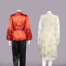 2-pc export pajamas c/o patterned silk top & black satin bottoms w/ patterned satin trim, both w/ elaborate standing frog closures, label “Imperials, Hong Kong”, top B 34”, L 24”, pants W 30”-32”, inseam 23”, (light wear, minor discoloration top,, 1.5” seam opening CF top waist, minor fabric strain SH, pants CB W elastic shot) Good; 2-pc silk crepe garden party dress w/ printed crepe de chine coat & hem, c. 1924, dress B 35”, W 34”, L 44”, jacket L 36”, (discoloration especially skirt, hem cut shorter, shatter to W ties, pulls, jacket: light underarm discoloration & few 0.25”-0.5” light stains) Fair.