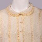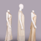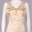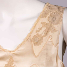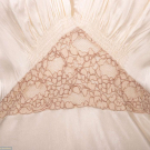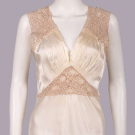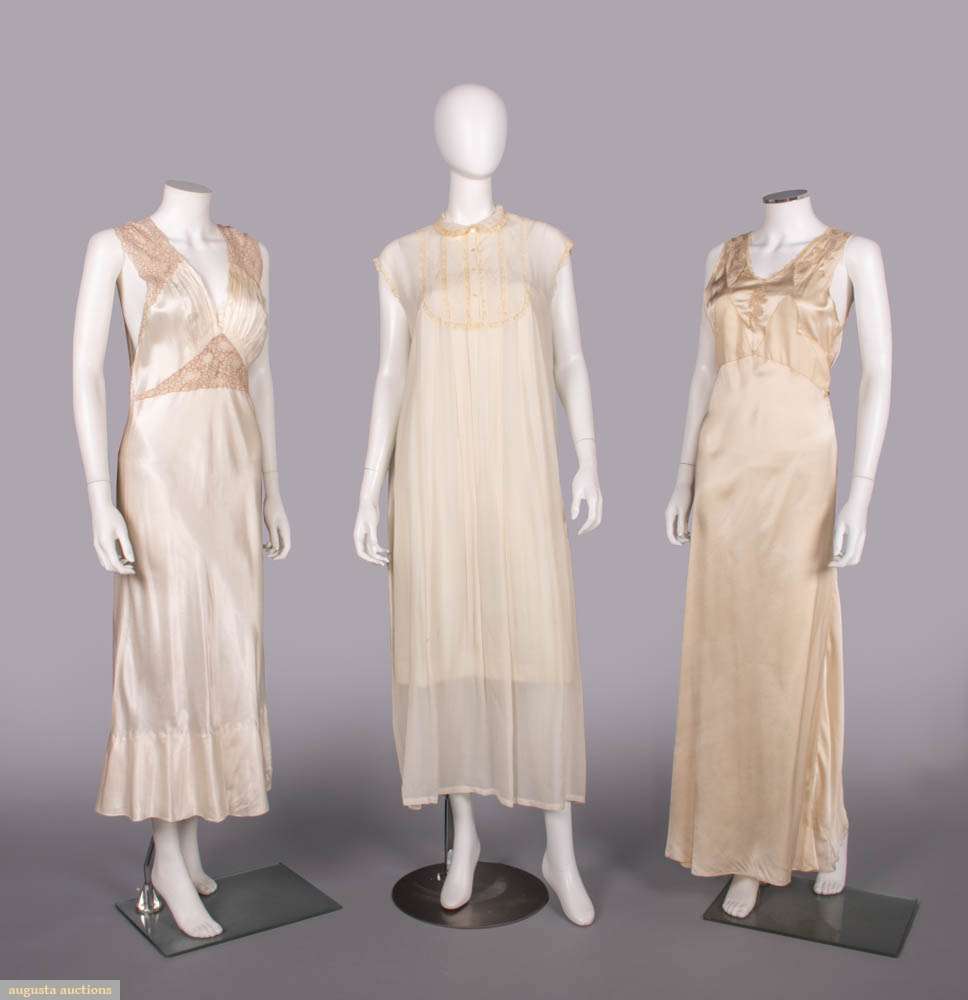 1 sleeveless cream silk nightgown w/ ecru mm guipure lace on open net ground to bodice, c.1933, B 35”, L 50”, (hem taken up 6”, 0.75” tear lower CB, minor discoloration near hem) Very good; 1 sleeveless white silk crepe nightgown w/ lace insertion and chevron tucks, c.1930, label “B. Altman and Co”, B 46”, L 52”, (several 0.5”-0.75” light stains) Excellent; 1 sleeveless silk charmeuse lingerie gown w/ embroidered insertions silk & plain inserted panels edged w/ Italian hem stitching, self CB ties inserted to SSs, c.1932, B 34”, L 58”, (armscyes altered, few tiny-1” very light stains) Excellent.