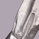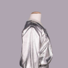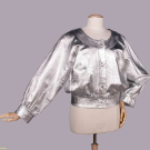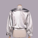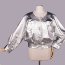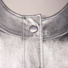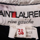 Silvered leather jacket w/ scoop neckline, CF self-covered buttons & black satin lining, label “Saint Laurent Rive Gauche”, B 40”, W 32”, L 23”, (several tiny-0.25” rubs & scratches around collar & right SH, light wear, discoloration & stamp on label) Excellent.