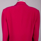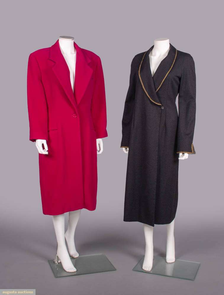 1 fuchsia wool coat w/ lapel collar, inset H pockets & gunmetal satin lining, label “Gianfranco Ferre”, B 42”, W 36”, L 44”, (light wear) Excellent; 1 lightweight grey wool coat w/ gold passementerie to asymmetrical shawl collar & cuffs, single button closure to left front H, silk lining, label “Chloe”, B 34”, W 28”, L 46”, (few tiny-0.25” holes, esp. under lapels, heavy wear interior W tie, discoloration & many tiny-0.5” stains & holes lining, some wear & tarnish to trim) Good.