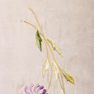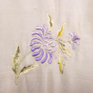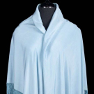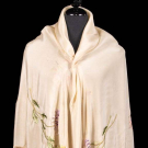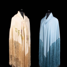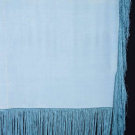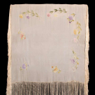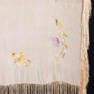 1 sky blue silk shawl w/ long knotted fringe, 50” x 53”, ~22” fringe, (light discoloration, few 0.25”-0.5” light stains, few tiny pulls, fringe slightly messy); 1 cream silk fringed shawl w/ hand embroidered ombre chrysanthemums & leaf motif embroidery, 64” x 56”, ~20” fringe, (light discoloration, few 0.25”-4” light stains, few tiny wear spots) Both very good.