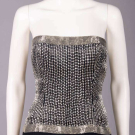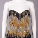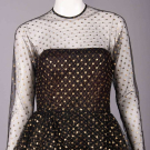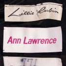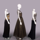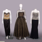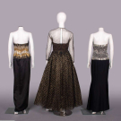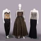 1 black silk shantung w/ strapless bodice encrusted in black & gold bugle beads, black, gold & silver sequins on gold lame’ ground, lined w/ silk chiffon, label “Ann Lawrence”, B 34”, W 26”, CFL 50”, (light wear, minor bead loss, few minor pulls); 1 black tulle w/ woven gold lame' polka dots over black silk tulle w/ woven lame grid, mesh petticoat, label “Lillie Rubin”, B 34”, W 26”, L 58”, (sm pulls esp. to gold threads, light wear to hem); 1 strapless black wool crepe bodice encrusted w/ short bugle beads & convex silver sequins, label “Lawrence”, B 34”, W 28”, CFL 53”, (light wear, minor bead loss esp. underarms & W, 3” tear hem lining, 11” seam opening skirt lining) All very good-excellent.