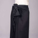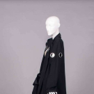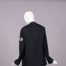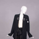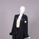 2-pc black wool c/o jacket w/ massive decorative silver grommets to lapels, across left front & sleeve, long sleeve & tabbed H pockets, matching ankle length skirt w/ grosgrain W & ties to thread through grommets at H, jacket B 46”, L 29”, skirt W 28”, L 37”, (missing jacket tie, light wear, minor discoloration interior underarms, 0.5” seam opening left SH grommet, some iron shine & few tiny repairs at Wband) Very good.