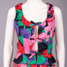2-pc patterned aqua cotton overprinted w/ purple & orange florals c/o blazer w/ floral corsage, patch pockets & enameled buttons, matching miniskirt, c. 1990, label “Christian Lacroix, Paris”, jacket B 36”, L 22”, skirt W 28”, L 16.5”, (few tiny stains, 0.75” seam openings both underarms, minor discoloration to underarm lining); 2-pc patterned cotton overprinted in red, pink, green & purple floral motif c/o vest top w/ CF tie closures & short peplum, matching ankle length skirt, 1970s, label “Louis Feraud, made in England by Rembrandt”, top B 36”, L 19”, skirt W 28”, L 40”, (light wear, few tiny stains & pulls, very minor underarm discoloration, light stains up to 1” skirt, velcro added to skirt Wband) Both very good.