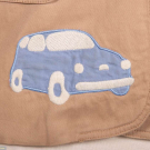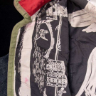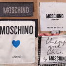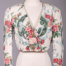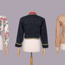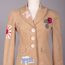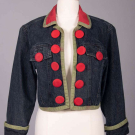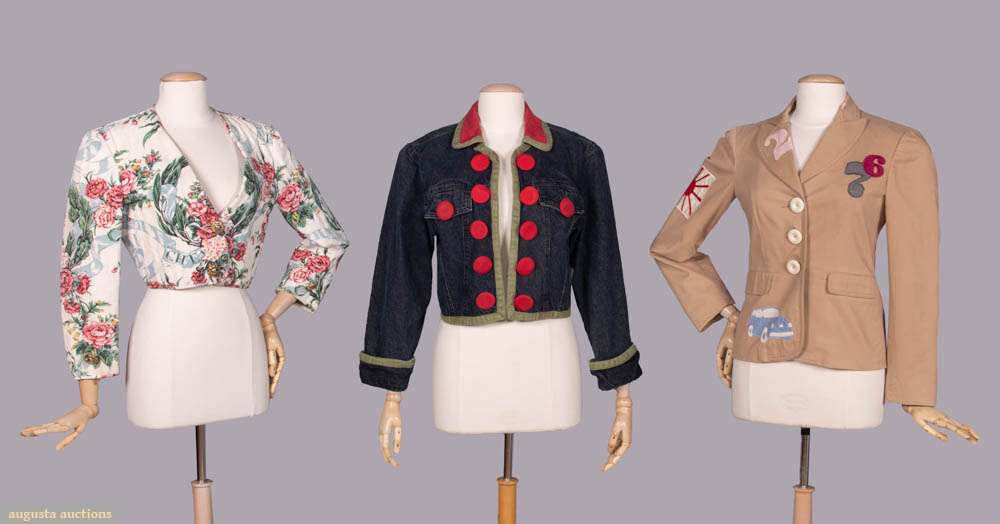 1 white ribbed cotton blend cropped jacket printed w/ carnation & rose motif, machine quilted, cast buttons, black & white cotton gingham lining, label “Cheap and Chic by Moschino”, B 38”, L 17”, (broad light discoloration, light wear to buttons, CF placket altered w/ 2 removed buttons) Good; 1 cotton denim w/ large red cloth covered buttons & collar, celadon flat braid to collar, CF opening & cuffs, lining printed in Venetian design w/ lion & gondolas, label “Moschino”, B 36”, L 19”, discoloration/red transfer to green trim & lining, wear to trim) Good; 1 tan cotton twill w/ applique & embroidered numbers, car & clouds, label “Moschino Jeans”, B 36”, L 24”, (several 0.25”-1” holes around collar & LF SH, discoloration esp. CB) Fair.