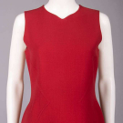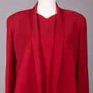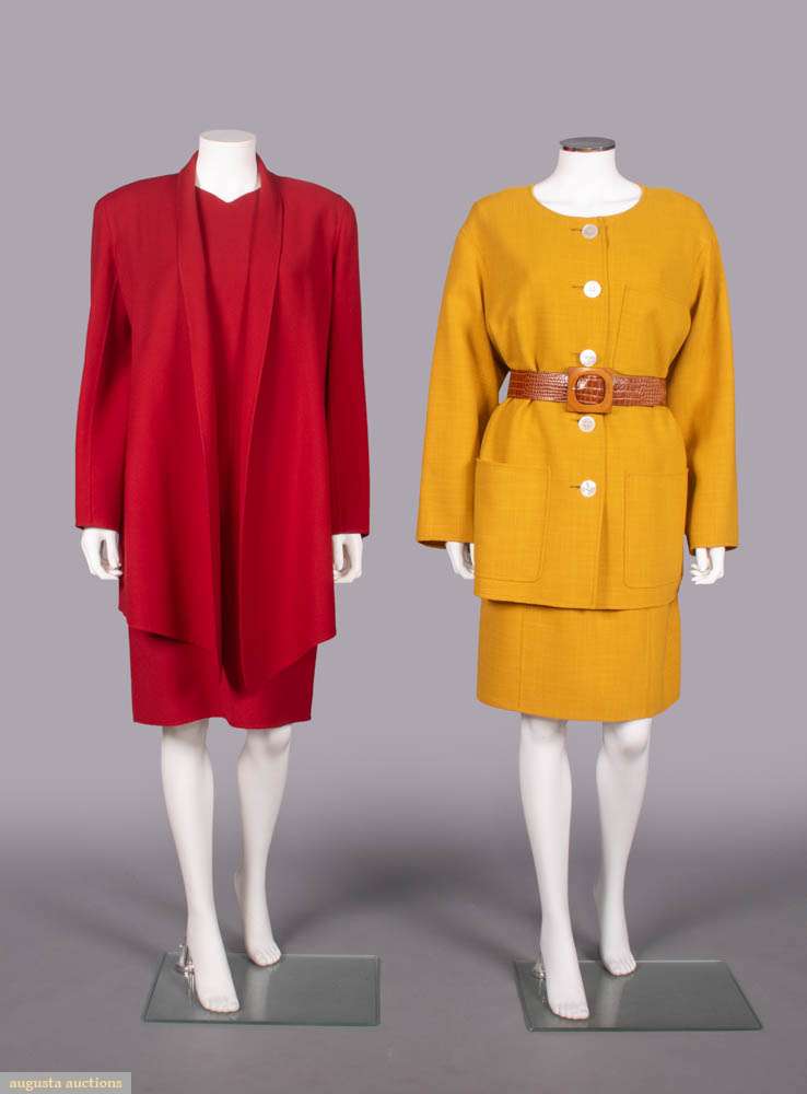 2-pc claret double faced wool c/o sleeveless sheath dress & cardigan jacket w/ pockets set into princess seam & free front, label “Oscar de la Renta”, dress B 36”, W 32”, L 39”, jacket B 42”, L 34”, (light wear, few tiny light stains CF jacket, moderate wear & light discoloration CB jacket collar) Excellent; 2-pc wool ensemble c/o short sleeved dress w/ MOP CB closures & front tabbed fitchet pockets, coat w/ patch pockets & MOP CF buttons closures, snakeskin belt w/ wooden buttons, label “Oscar de la Renta”, dress B 38”, W 32”, L 38”, jacket B 42”, L 30”, belt L 28.5”-32”, (light wear esp. along seams, few tiny stains & pulls, extra hole created in belt, minor discoloration dress lining collar & underarms) Very good.