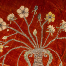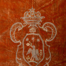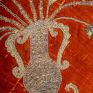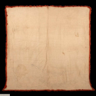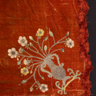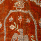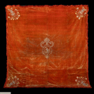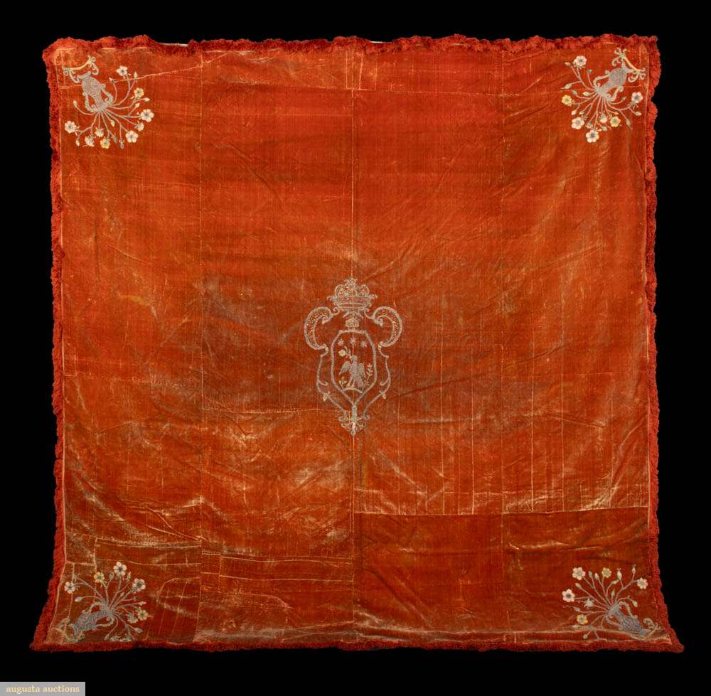 Easter covering of silk velvet w/ metallic embroidery including central medallion depicting colomba, corona & vases of spring florals, 81” x 84”, (broad crushing & discoloration, wear & areas of pile loss, tarnish & some loss to embroidery, some bead & sequin loss, fringe heavily shedding & disintegrating, few sm tears & tiny holes, shatter & discoloration to backing, areas of piecing possibly repair) Fair-poor. Provenance: Brooklyn Museum.