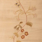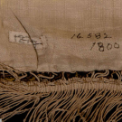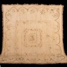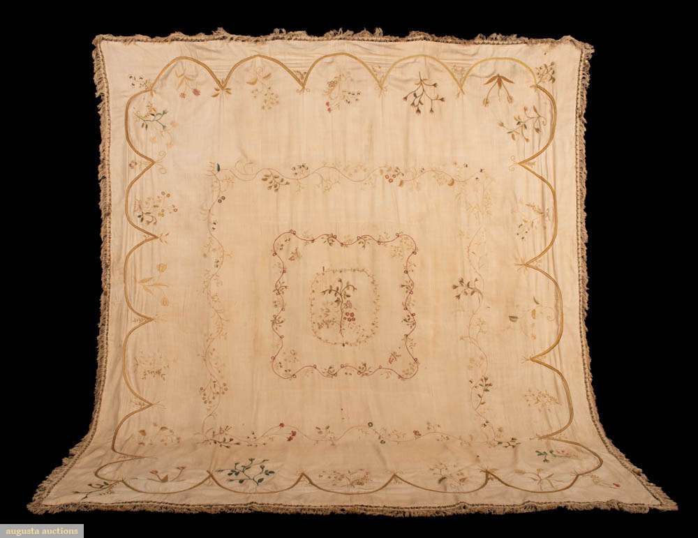 Linen bed covering w/ crewelwork embroidered central floral medallion w/ scrolling ribbon & floral borders, cotton & silk passementerie braid w/ cotton & wool tassels, natural linen backing, 102.5” x 108”, (broad discoloration, several 0.25”-0.5” stains & 0.25”-0.75” holes, several breaks in border trim, few tears up to 3”, broad wear/thinning to fabric, some shatter to backing) Fair. Provenance: Brooklyn Museum.