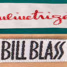 1 pink & purple satin stripe on chiffon overpainted w/ spot motif, round neck opening over CB keyhole, long sleeve, elasticized W, lined w/ cream silk crepe de chine, label “Bill Blass”, B 38”, W 26”, L 58”, (minor shatter left SH w/ few tears up to 0.75”, sm pulls throughout, few tiny stains esp. hem) Good; 1 painted green & navy calligraphy motif on cerulean blue silk crepe ground w/ square neckline, long flutter sleeve w/ single snap at wrist, left front self-covered button & snap closures, matching scarf, lined in silk crepe, label “Pauline Trigere”, B 36”, W 32”, L 54”, scarf 46” x 34”, (minor discoloration lower CB, few scattered sm pulls & light stains, few tiny holes scarf) Excellent.