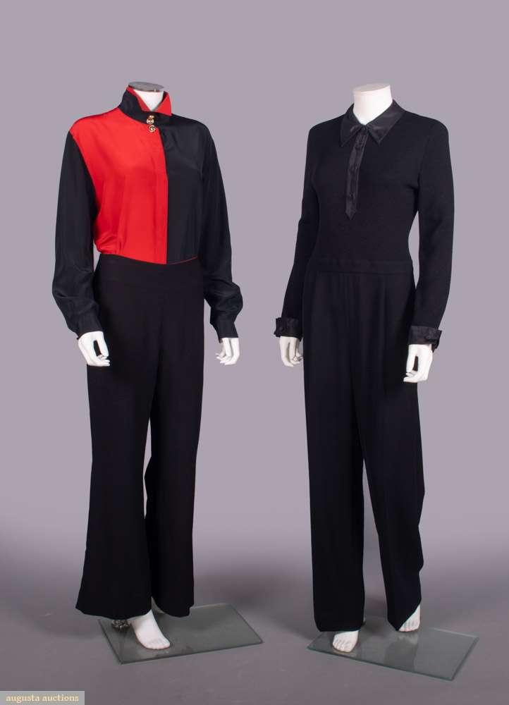 2-pc black & scarlet ensemble c/o silk mi parti blouse & crepe hip huggers w/ scarlet satin lining to SS slits, label “Louis Feraud Set”, blouse B 46”, L 27”, pants W 30”, inseam 30” , (few tiny-0.5” light stains CF blouse, few tiny pulls pants); 1 black knit jumpsuit w/ marino knit top & wool bottom, black silk taffeta collar, CF & cuffs, label “Valentino, Miss V”, B 36”-38”, W 30”-32”, L 60”, (light wear) Both excellent.
