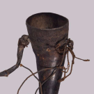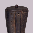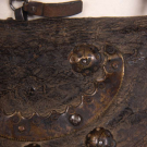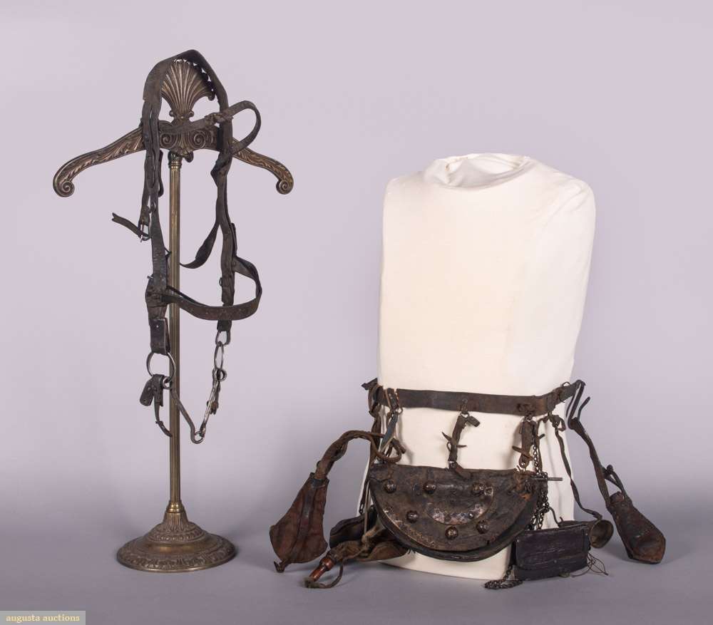 1 traveler’s belt w/ crescent shaped bag w/ tooled metallic decorations or bosses, 1 flint & tinder kit w/ tooled metal overlay, 3 pouches w/ wooden stoppers, 2 powder horns w/ metallic tooled trim, 18” x 1”, large pouch 9.25” x 5”, (heavy wear & patina to materials, belt broken in two w/ old repair, leather dry w/ varying cracks, heavy tarnish to metal trim, metal trim loss large pouch, few loose elements, residual odor); 1 bridle, L 18”, bit W 8”, (broad wear & cracking to leather throughout, few straps broken off at ends, moderate tarnish to metal, residual odor) Both fair. Provenance: From the Estate of Lydia Gordon.