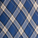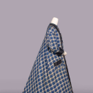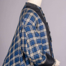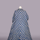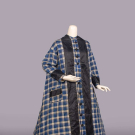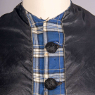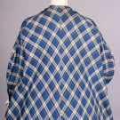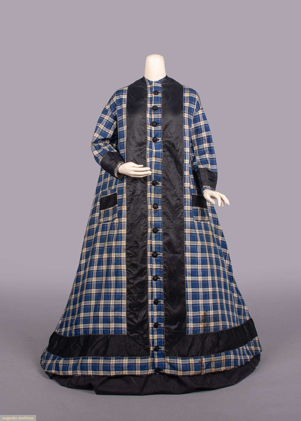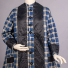 Blue & cream plaid wool wrapper w/ applied black silk taffeta bands to CF, cuffs, patch pockets & hem, patterned silk covered CF button w/ velvet,, B 42”, L 52”, (0.25”-1” light stains throughout, several stains to 3” esp. hem, several tiny-0.25” holes, few 0.5”-2” tears in silk trim, broad light discoloration, heavy wear/loss to hem trim, discoloration & staining lining, wear to button w/ 1 loose & 1 missing) fair-good. Provenance: From an important New England Historical Society.