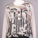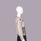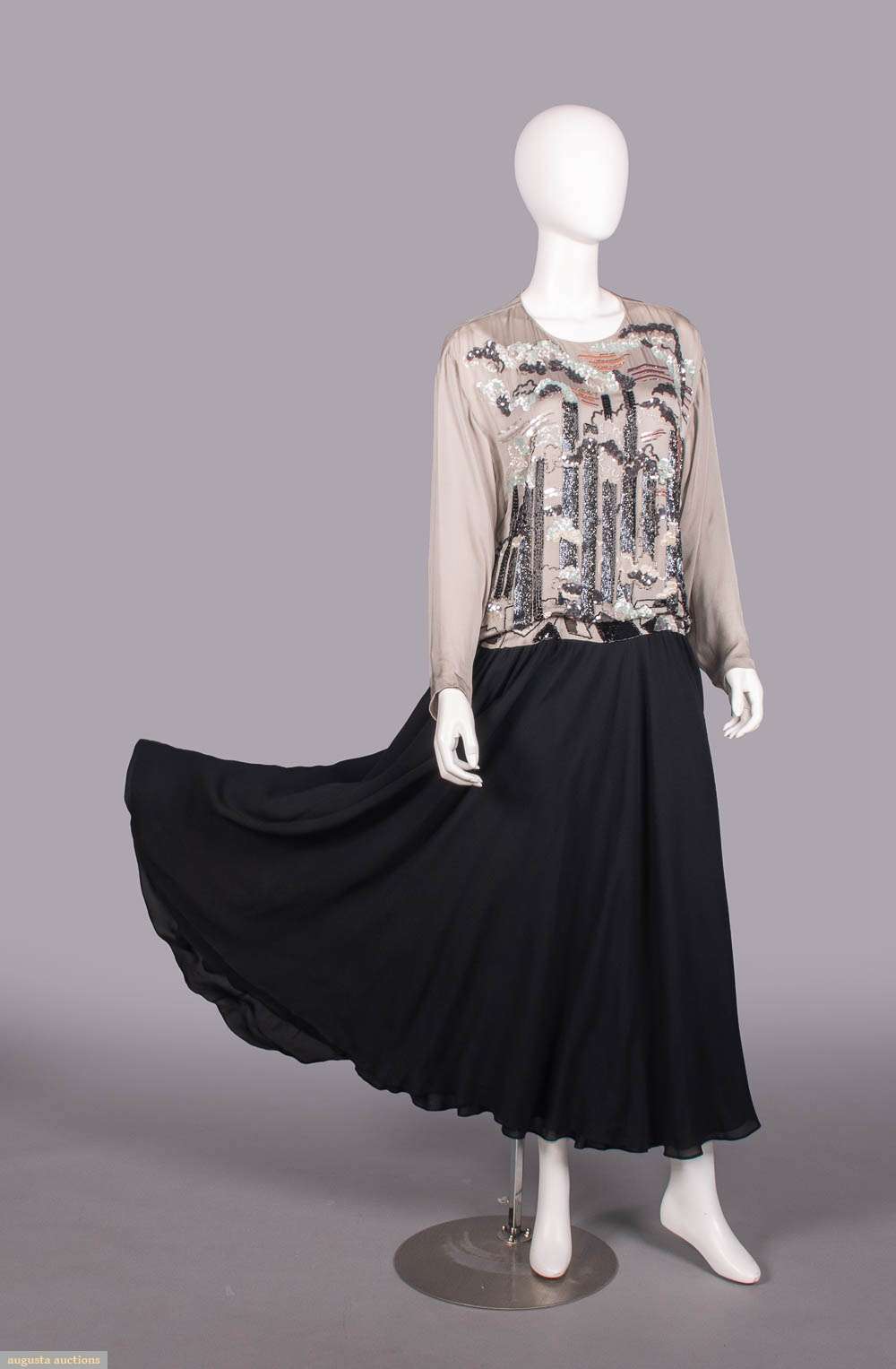 Beaded & sequined grey & black silk dress w/ pink & peach iridescent & silver sequins, black & metallic short bugle beads, fitted dropped W w/ geometric motif, label “Karl Lagerfeld”, custom made per consignor, B 38”, W 32”, L 54”, (light discoloration CF bodice, 2” light stain RT cuff, few tiny stains, minor pulls, integrated slip straps broken, 1 shoulder pad missing) very good