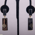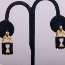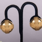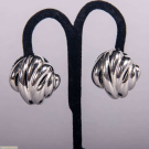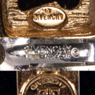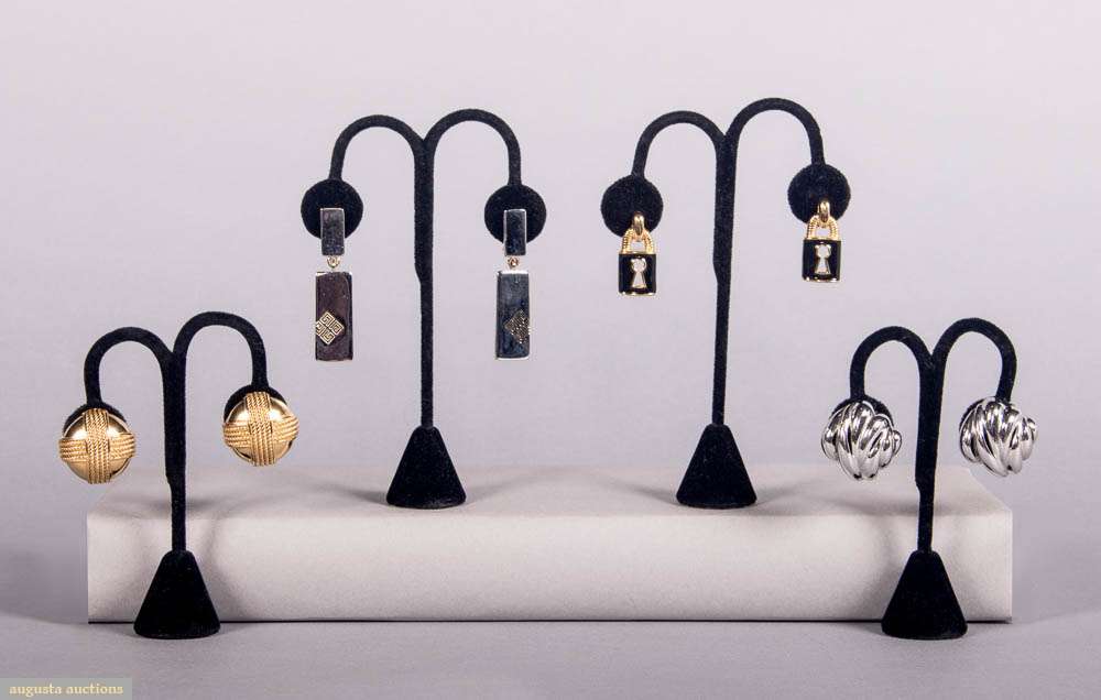 1 pair of gold-tone cross hatch chain motif earclips, “Givenchy”, 28 mm x 28mm; 1 pair of rectangular silver earclips w/ Greek Key inspired logo motif, “Givenchy”, 14 mm x 57 mm, (light wear, minor pitting); 1 pair of gold tone earstuds in cast lock motif w/ black enamel, “Givenchy”, 15 mm x 32 mm; 1 pair of silver organic shell motif earclips, “Givenchy, Paris, New York”, 29 mm x 30 mm, (green discoloration interior, residue on clips, light wear) All very good-excellent.